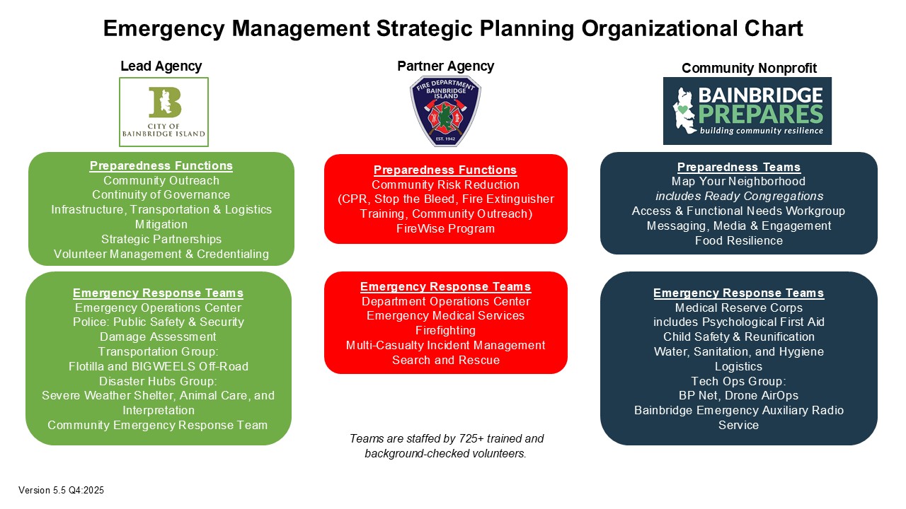 The Bainbridge Prepares partnership* is a three-way partnership between the Bainbridge Island Fire Department, the City of Bainbridge Island, and the community nonprofit Bainbridge Prepares. The partnership is designed to increase the resilience of Bainbridge Island and surrounding areas by focusing on individual and community preparedness. Learn more
